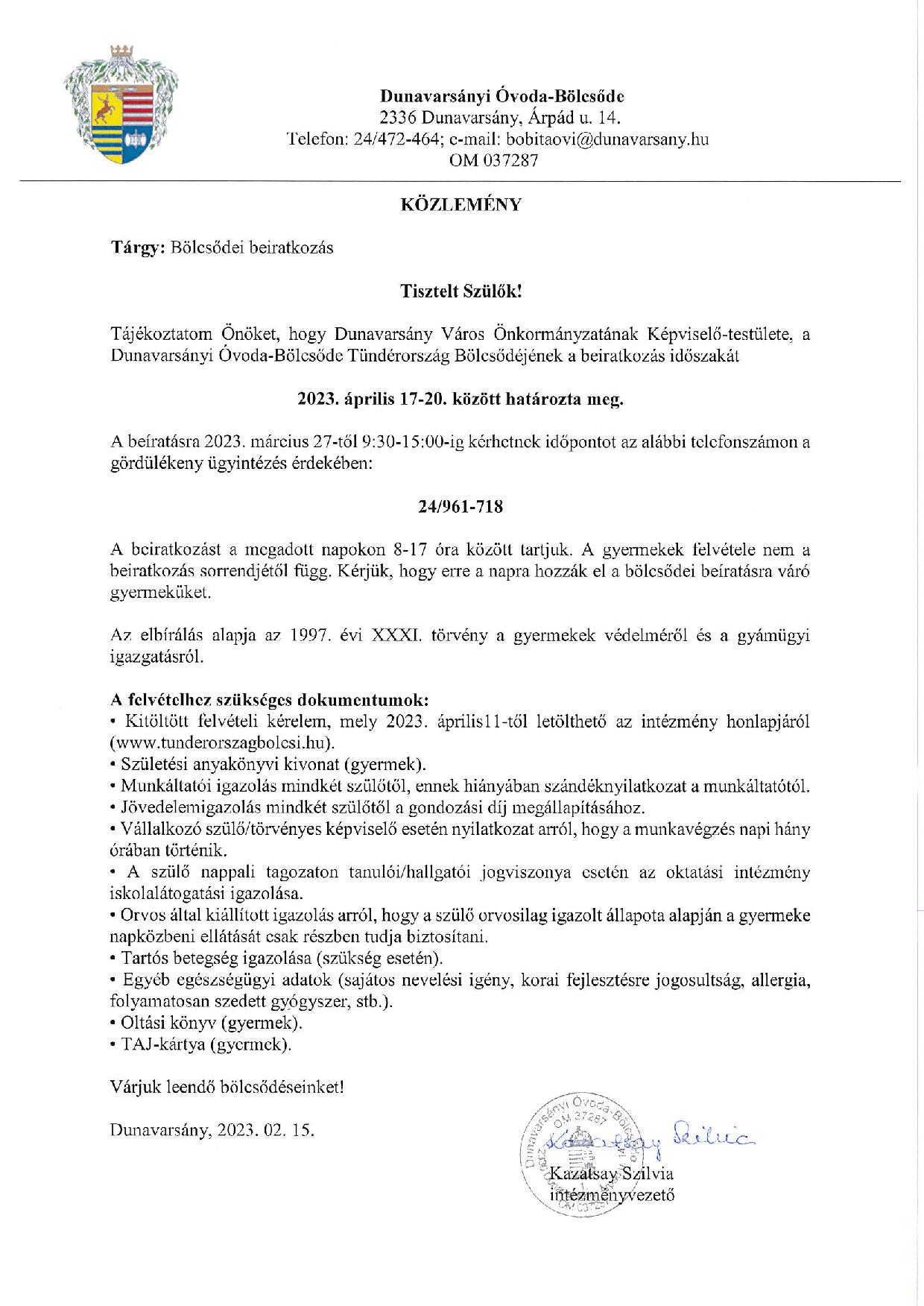 Óvodai és bölcsődei beiratkozások – Felhívás